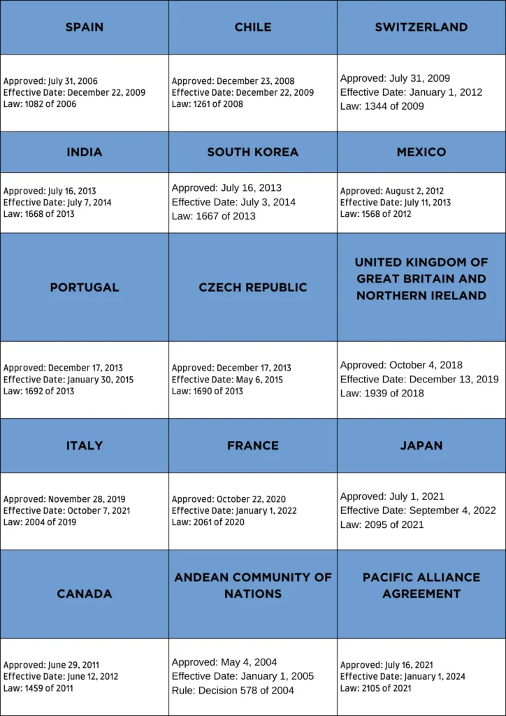 In Colombia, several treaties of this type have been signed, and others are in the process of approval. Below, we provide detailed tables summarizing the agreements currently in force and those under formalization, along with key dates and the applicable regulations, offering a clear guide to the development of these treaties.